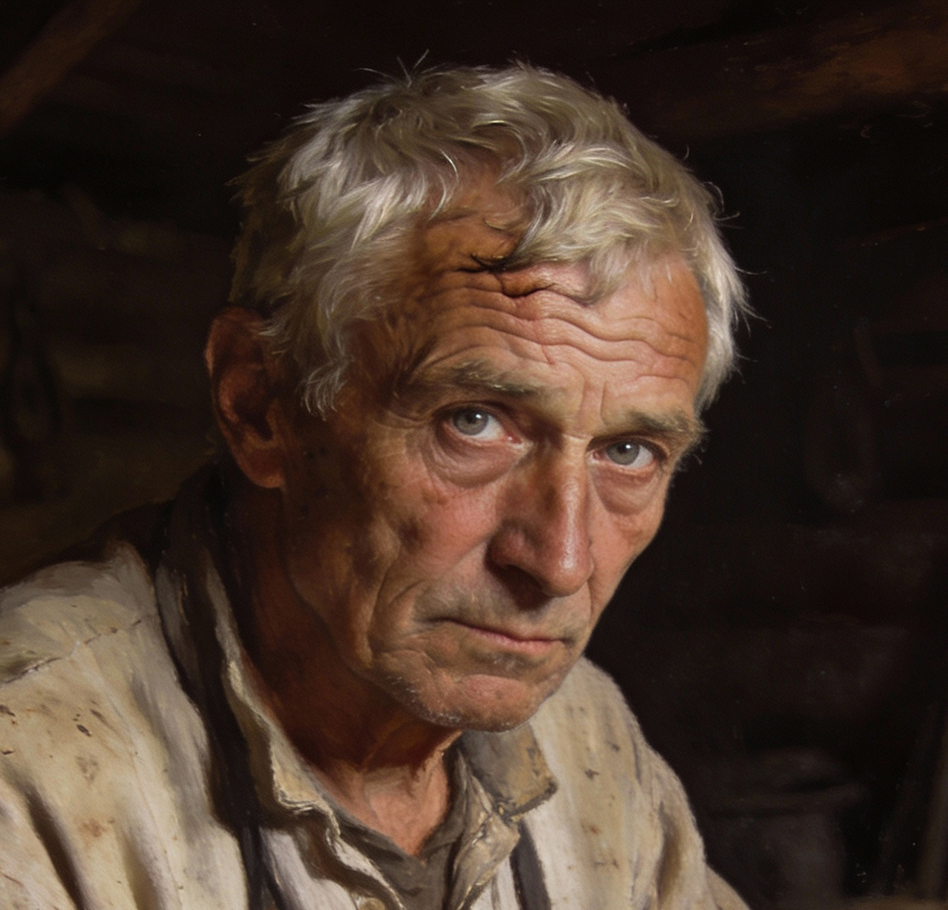 Белорусская деревня, предположительно 1900-е годы. Старый бондарь Данила славился на всю округу своими изделиями: вёдрами, корытами, ложками.