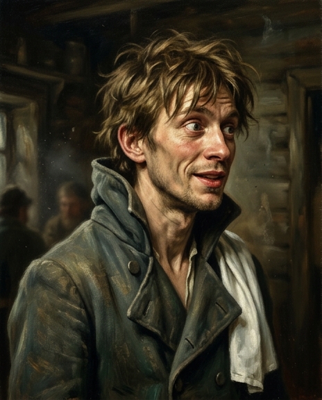 На дворе гостиницы господина встретил трактирный слуга — живой и вертлявый, в длинном сюртуке. Он проворно повёл Чичикова по деревянной галерее и показал отведённый ему покой.