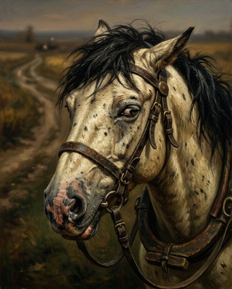 Тем временем кучер Селифан вёл оживлённую беседу с лошадьми. Особенно доставалось чубарому пристяжному коню, который хитрил и отлынивал от работы, лишь делая вид, что тянет бричку.