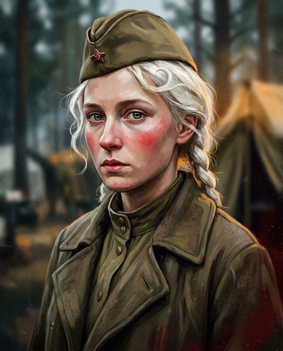 В августе на батарее появилась военфельдшер из санчасти — молодая девушка с острым носиком, серыми живыми глазами и неестественно белыми волосами.