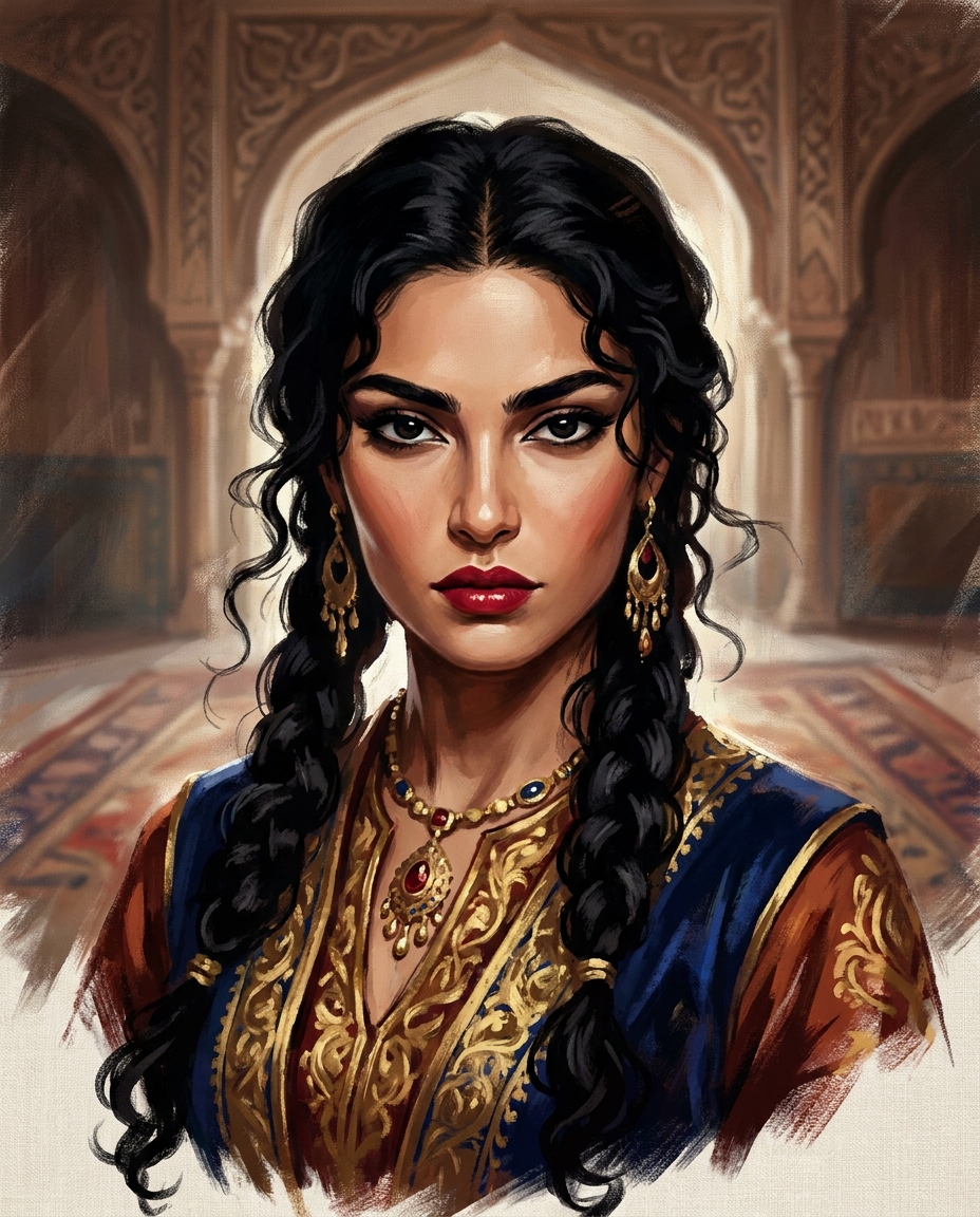 Родинки чёрные, брови чёрные, косы чёрные, а зубы белые-пребелые, как жемчуг, уста, словно рубины, а глаза, кажется, так и кричат — убью, убью! ... ашуг Джунун с одного взгляда обезумел...