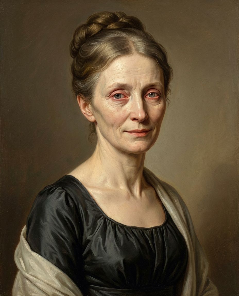 Женщина примерно 45 лет, славянской внешности, русская дворянка. Худощавое, осунувшееся, бледное лицо с мелкими морщинами — когда-то привлекательное, но рано постаревшее от забот и лишений. Черты лица правильные, тонкие, но заострённые от худобы. Кожа бледная, с лёгкой нездоровой серостью. Глаза светлые (серые или голубые), немного покрасневшие, слегка припухшие — «исплаканные», но при этом внимательные и цепкие, с выражением просительной кротости, за которой скрывается железная воля и расчётливый ум. Взгляд — мягкий, но настойчивый. Волосы русые, с ранней проседью, аккуратно убраны наверх в причёску по моде начала XIX века (стиль ампир). Телосложение худощавое, стройное, с прямой осанкой — она старается держаться достойно. Одета в скромное шёлковое платье в стиле ампир тёмного (возможно перекрашенного) цвета, с высокой талией; на плечах — лёгкая шаль. Платье не роскошное, но аккуратное — видно, что женщина из хорошей семьи, но обеднела. Выражение лица: полуулыбка с оттенком тревоги, деловой озабоченности и напускной христианской кротости. Она привыкла просить и добиваться, и это отпечаталось в лице — сочетание мягкости и скрытой настойчивости.