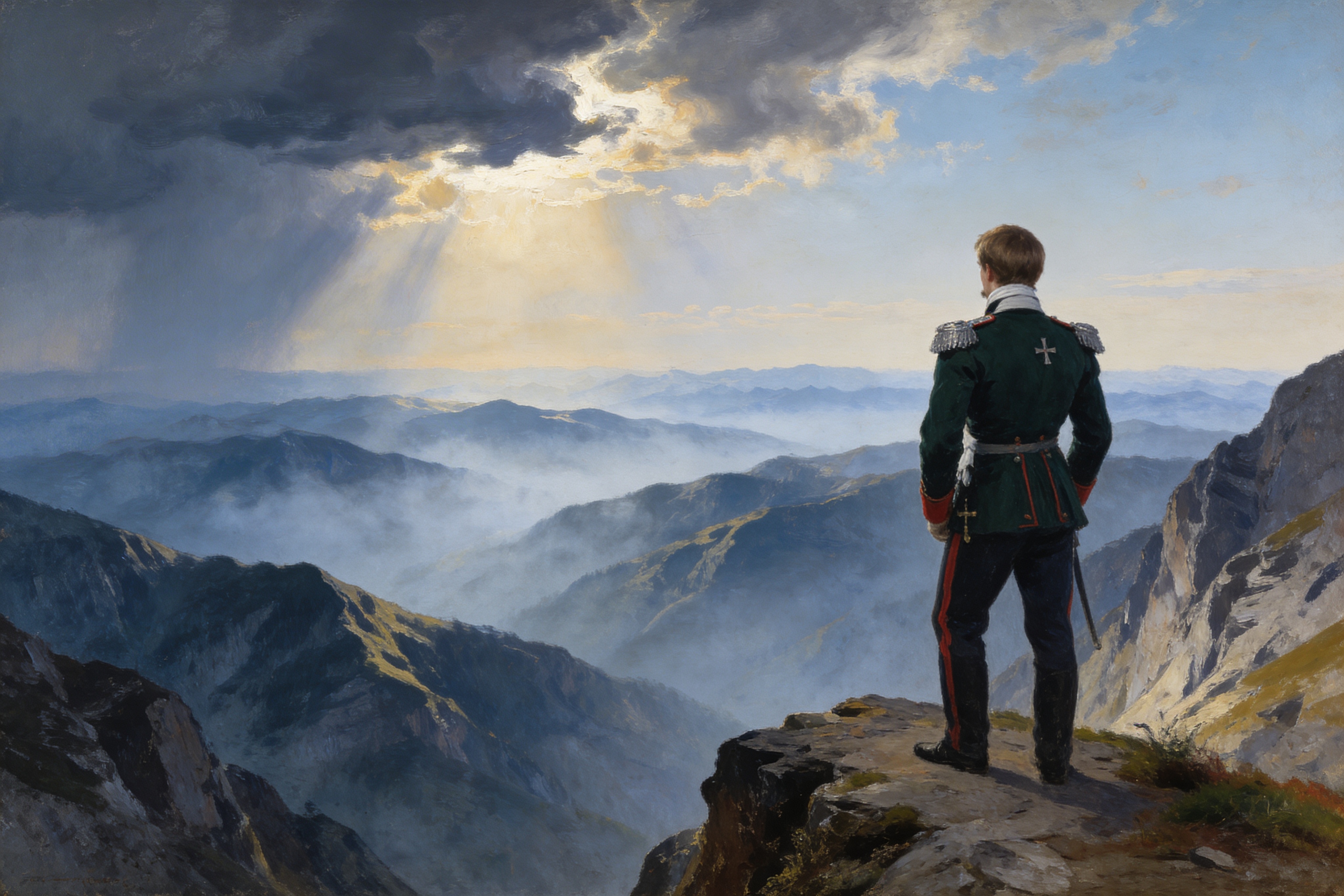 Одинокий молодой русский офицер 19-го века (Печорин) стоит спиной к зрителю на краю горного обрыва в горах Кавказа. Перед ним бесконечные туманные хребты, уходящие вдаль, в холодную дымку. Небо драматичное, предгрозовое, с проблесками света сквозь облака. Атмосфера одиночества, внутреннего разлада и обреченности. Цвета сдержанные: холодный синий, серый и приглушенные золотистые оттенки. На изображении нет текста.