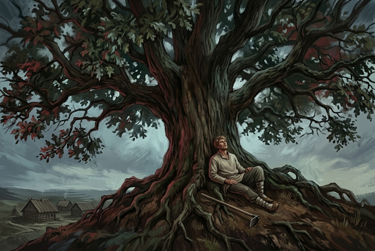 Конец XIX — начало XX века, сельская местность Восточной Европы, вершина крутой горы. Центр композиции занимает невероятно толстый, древний дуб с мощными узловатыми корнями. Его огромные ветви раскинуты широко в стороны, занимая верхнюю половину пространства. У самого основания ствола, прямо на земле в густой тени дерева, лежит спящий крестьянин (CHAR1). Вокруг ствола — сухая, каменистая почва с редкими пучками травы, подчеркивающая одиночество гигантского дерева на вершине. На дальнем плане видно ясное летнее небо. Масштаб сцены выстроен так, чтобы показать подавляющее величие старого дуба по сравнению с небольшой фигурой отдыхающего человека.