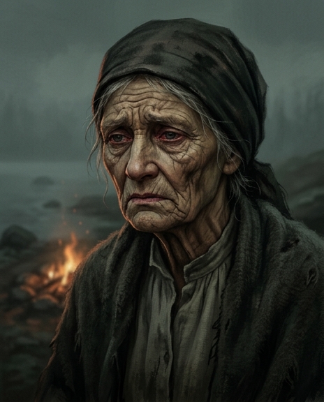 Очень старая женщина восточноевропейского крестьянского фенотипа, выглядящая древней и глубоко измождённой. Лицо густо изрезано глубокими морщинами, кожа сухая, обветренная, серая от въевшейся копоти. Глаза впалые, тусклые, с покрасневшими, припухшими от едкого дыма и постоянных слёз веками; во взгляде читается вековая скорбь и невыносимая тяжесть. Седые, тусклые волосы небрежными прядями выбиваются из-под тёмного, ветхого крестьянского платка, повязанного низко над бровями. Одета в грубую, изношенную серую холщовую рубаху и старую тёмную суконную свитку, испачканную сажей. Плечи тяжело опущены, голова слегка втянута, выдавая старческую сутулость и покорность судьбе. Выражение лица застывшее, отражающее тихое, безнадёжное горе и абсолютную усталость.