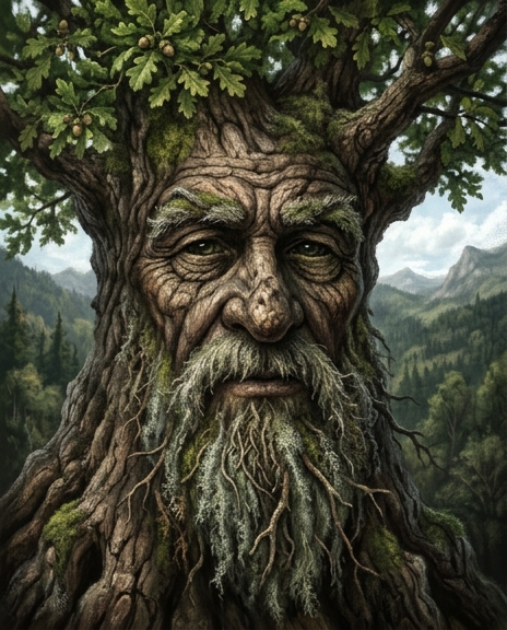 Крупный план верхней части поваленного исполинского дуба, тяжело лежащего на боку на земле. Композиция выстроена как классический портрет: массивная часть ствола занимает центр кадра. Грубая, глубоко растрескавшаяся кора и древесные узлы образуют антропоморфные черты — подобие очень старого, мудрого мужского лица с выражением тихого покоя и усталости. Дерево выглядит древним и жестоко покалеченным: один бок ствола почернел и обуглен огнём, местами кора грубо соскоблена до обнажённой древесины. Вокруг «лица» торчат обрубки старых спиленных ветвей, а также огромные, когда-то раскидистые сучья, свежесломанные недавней бурей. Остатки поникшей листвы и мелкие ветки обрамляют ствол наподобие всклокоченных волос и растрепанной бороды старика. Несмотря на поверженное состояние, визуально ощущается невероятная толщина и былая непреклонная мощь древесного великана.