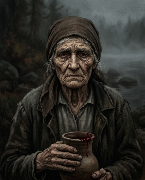 Глубокая старушка славянского крестьянского типа, олицетворяющая многовековое страдание. Худощавая, с поникшими, сутулыми плечами. Лицо изможденное, испещренное глубокими морщинами, с сухой, обветренной кожей. Седые волосы убраны под повязанный по-крестьянски старый, выцветший холщовый платок. Глаза запавшие, тусклые, полные тихой скорби, безмерной усталости и непреклонной покорности. Одета в ветхую, грубую крестьянскую рубаху темных тонов из домотканого сукна. На уровне груди ее натруженные, узловатые руки сжимают старую темную глиняную кружку с запекшимися красноватыми следами на крае. Выражение лица кроткое, страдальческое, передающее несокрушимую, тихую силу.