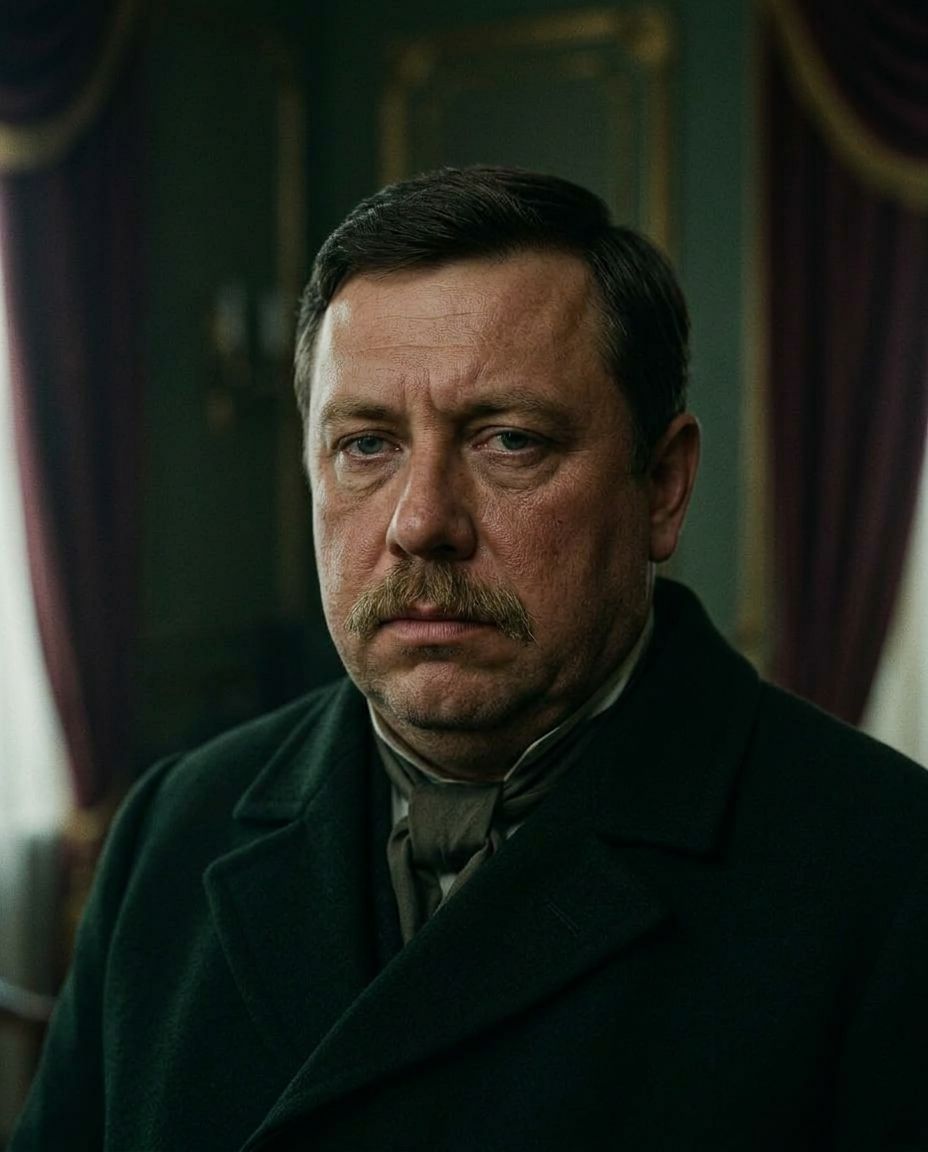Кинематографичный психологический реализм в стиле престижных исторических драм. Эстетика комфортного упадка: тяжёлая палитра бутылочно-зелёных, тускло-золотых и пыльно-бордовых тонов. Мягкий давящий свет, обволакивающие глубокие тени, оптическая глубина, благородное плёночное зерно. Визуальный акцент на медленное внутреннее омертвение и моральную тяжесть под маской респектабельности.