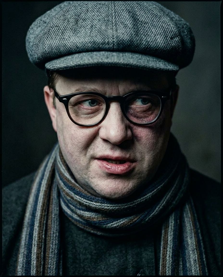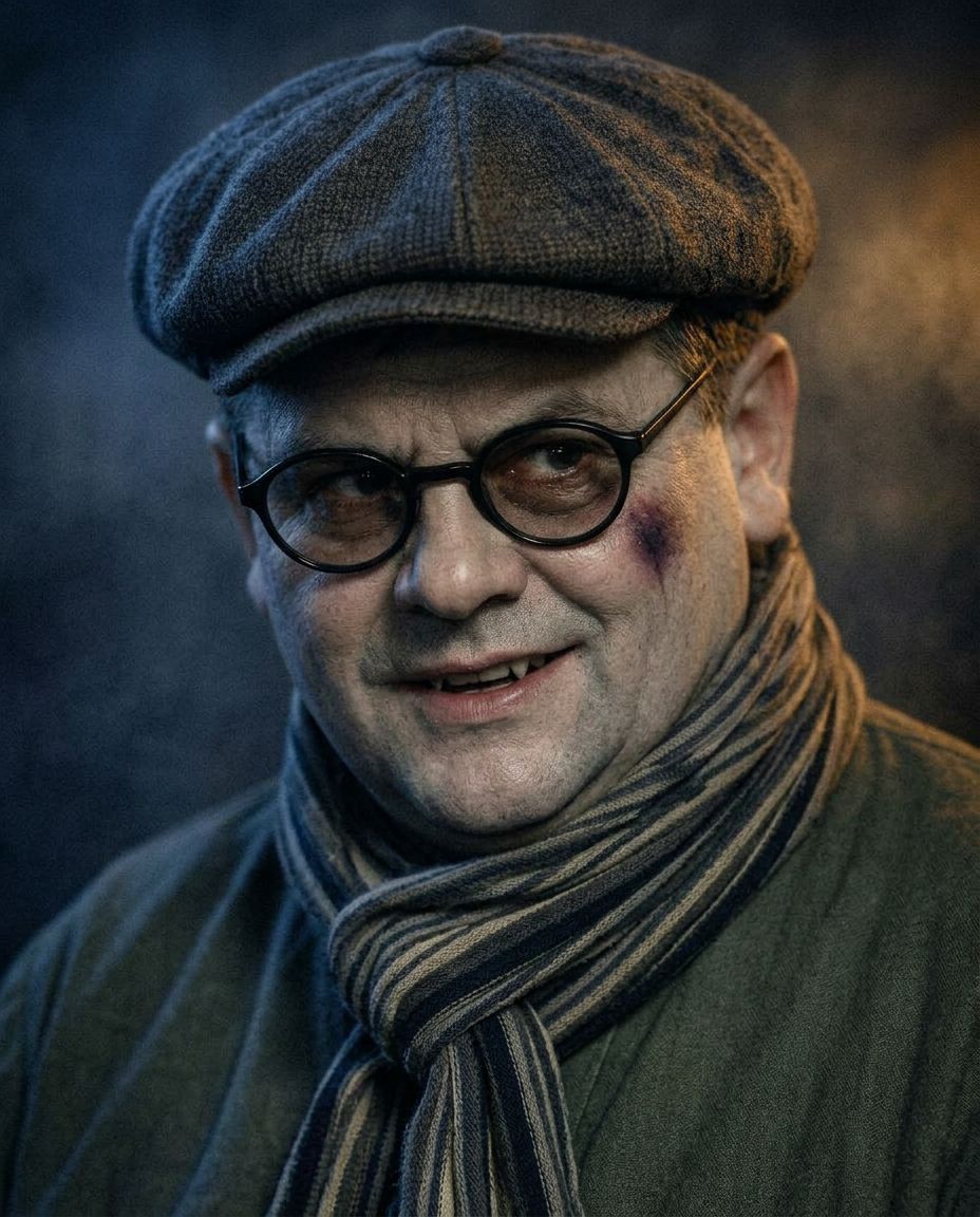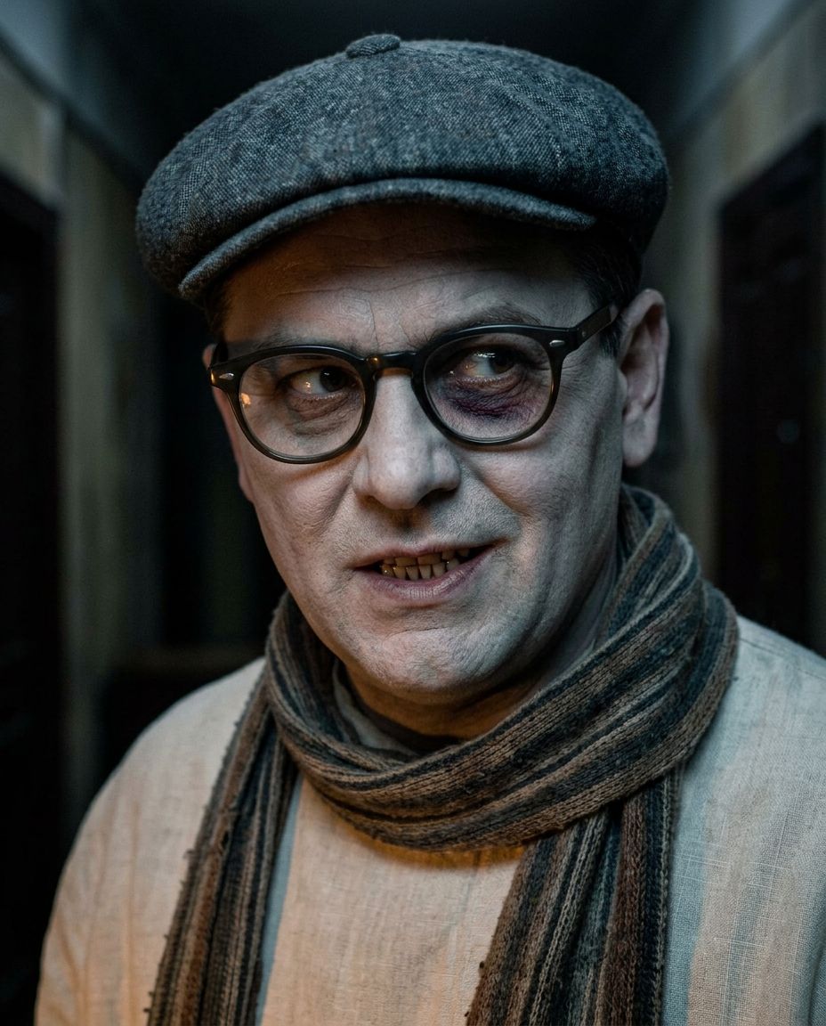 Мужчина средних лет (около 45–50 лет), славянская внешность, худощавое телосложение. Круглое, гладко выбритое лицо без бороды и усов. Кожа мертвенно-бледная, нездорового мелового оттенка — неестественно белая, словно обескровленная. Под правым глазом, у самого носа — крупный тёмно-лиловый синяк. Глаза за очками в тёмной роговой оправе смотрят воровато, трусливо, бегают по сторонам; взгляд колючий и настороженный. Выражение лица — злобная ухмылка, кривая недобрая усмешка, обнажающая зубы; губы слегка приоткрыты, будто он собирается присосаться или причмокнуть. Общее впечатление — жутковатое, отталкивающее, пародийно-зловещее: не величественный вампир, а жалкое, напуганное, но опасное существо. На голове — серая матерчатая кепка-восьмиклинка с утиным козырьком, надвинутым низко на глаза, чтобы затенить лицо. Одет в светлую льняную толстовку (свободная рубаха-блуза с поясом, типичная для советских служащих 1930-х). На шее, несмотря на летнюю жару, намотано старое полосатое кашне — шарф, скрывающий следы укуса на горле. Лицо слабо освещено снизу, от чего тени под глазами и скулами кажутся провалами.
