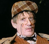 Мужчина средних лет, европеоидной внешности, славянского типа. Непропорционально высокий и болезненно худой, с очень узкими плечами и маленькой головой — всё вместе создаёт нелепый, вытянутый силуэт, напоминающий музыкальный инструмент фагот. Лицо узкое, вытянутое, скуластое, с впалыми щеками, нагловатое и глумливое. Кожа бледная, немного нездоровая, землистая. Маленькие, глубоко посаженные глазки — хитрые, ироничные, с мутноватым полупьяным блеском. Тонкие жидкие усики — редкие, торчащие в стороны, похожие на куриные пёрышки. Рот кривится в насмешливой, шутовской ухмылке. На носу — старое треснувшее пенсне (без дужек, держится на переносице). На маленькой голове сидит нелепый жокейский картузик. Одет в короткий, тесноватый клетчатый пиджак — дешёвая, потрёпанная, кургузая одежда, подчёркивающая нескладность фигуры. Общее впечатление — опустившийся, комичный, нарочито несуразный человек, при этом в его взгляде и ухмылке читается скрытый демонический ум и издёвка. Выражение лица — наглая, кривая, всезнающая усмешка, как у ярмарочного фокусника, готового обмануть.