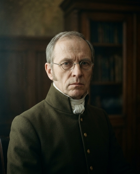 Мужчина около пятидесяти-шестидесяти лет, европейского (русского или немецкого) фенотипа, типичный педагог-чиновник первой трети XIX века. Лицо сухое, педантичное, с тонкими, плотно сжатыми губами и холодным, строгим взглядом. Кожа бледная, с возрастными морщинами. Волосы седеющие, гладко зачесанные, с заметными залысинами; на щеках небольшие аккуратные бакенбарды. На носу круглые очки в тонкой металлической оправе. Телосложение худощавое, осанка прямая и жесткая, выражающая привычку к строгой дисциплине. Одет в темный форменный вицмундир или строгий закрытый сюртук, застегнутый на все пуговицы, с высоким стоячим воротником и туго повязанным белым шейным платком. Выражение лица бесстрастное, суровое и бюрократическое, полностью лишенное живых эмоций.