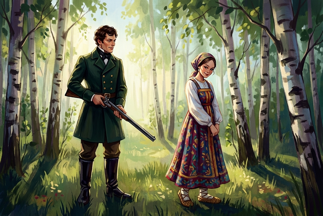 1820-е годы, Российская империя, летнее утро в берёзовой роще на границе двух поместий. На лесной поляне с мягким утренним светом, падающим сквозь берёзы, стоит CHAR1 в образе крестьянки, слегка повернувшись к CHAR2 и держа в руках простую корзинку; CHAR2 стоит напротив неё в охотничьем костюме, глядя с интересом и восхищением. Композиция простая и читаемая: две фигуры занимают центр кадра на среднем расстоянии друг от друга, вокруг — только трава, несколько берёз и лёгкая лесная глубина, без лишних деталей.