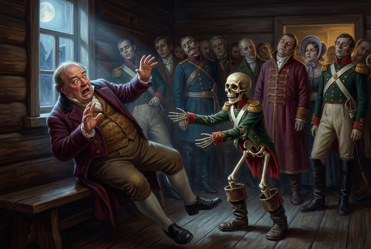 Россия, Москва, начало XIX века, лунная ночь, интерьер комнаты в деревянном доме. На переднем плане мрачный гробовщик Адриан (CHAR1) в ужасе отшатывается назад и инстинктивно выставляет руки вперед, защищаясь. Прямо на него надвигается маленький скелет (CHAR2), раскинувший руки для объятия. На среднем плане позади них сгрудилась неподвижная толпа мертвецов в разнообразных старинных одеждах, их лица скрыты в полумраке, а вдоль стен расставлены гробы разных размеров. Холодный лунный свет падает из окна, акцентируя внимание на фигуре отступающего человека и наступающем на него костяке, оставляя углы просторной комнаты в глубокой тени. Композиция строится на резком встречном движении двух центральных фигур.