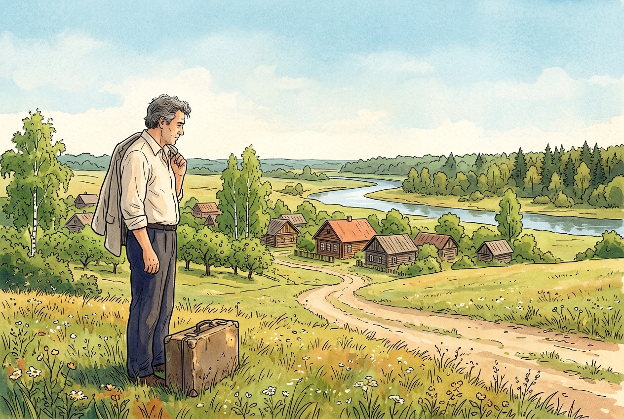 Лиричный европейский графический роман, визуальная поэзия и ностальгия. Живой чернильный контур, полупрозрачная акварель, фактура плотной шероховатой бумаги. Тёплая природная палитра: луговая зелень, охра, терракота и медово-янтарные оттенки памяти с глубокими индиговыми тенями. Мягкий рассеянный свет, золотистое свечение, кинематографичная чувственность и атмосфера светлой меланхолии.