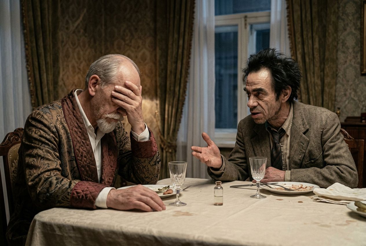 СССР, Москва, середина 1920-х годов. Просторная и богатая столовая в профессорской квартире, поздний вечер. За столом разворачивается ключевая психологическая сцена всего произведения: профессор Преображенский (CHAR1) сидит слева, тяжело ссутулившись и закрыв лицо ладонью, как человек, у которого кончилось терпение и силы слушать очередную чудовищную нелепость. Справа от него сидит Полиграф Шариков (CHAR2), подавшись вперёд и что-то самоуверенно, нагло и бессвязно объясняя, с выразительным жестом руки. Композиция камерная, почти театральная: главное напряжение сосредоточено в контрасте между усталым отчаянием CHAR1 и хамской самоуверенностью CHAR2. На столе видны рюмки, небольшой стеклянный пузырёк, скатерть и следы недавнего ужина. На заднем плане — узорчатые обои, тяжёлые шторы и окно, подчёркивающие уютный, буржуазный, старомосковский интерьер, который Шариков своим присутствием разрушает изнутри.