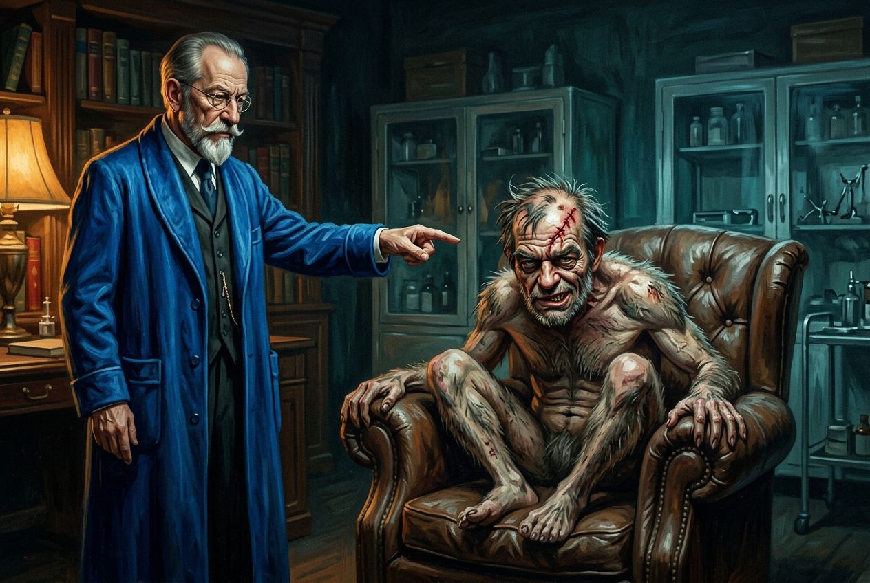 Пожилой седой профессор с усами. Выглядит очень властным, энергичным, полным достоинства и слегка насмешливым. Одет в дорогой, просторный домашний халат насыщенного лазоревого (ярко-голубого) цвета. Его поза выражает полное превосходство, спокойствие и триумф уверенного в себе хозяина положения.