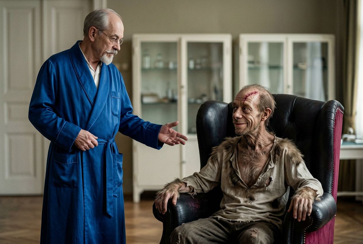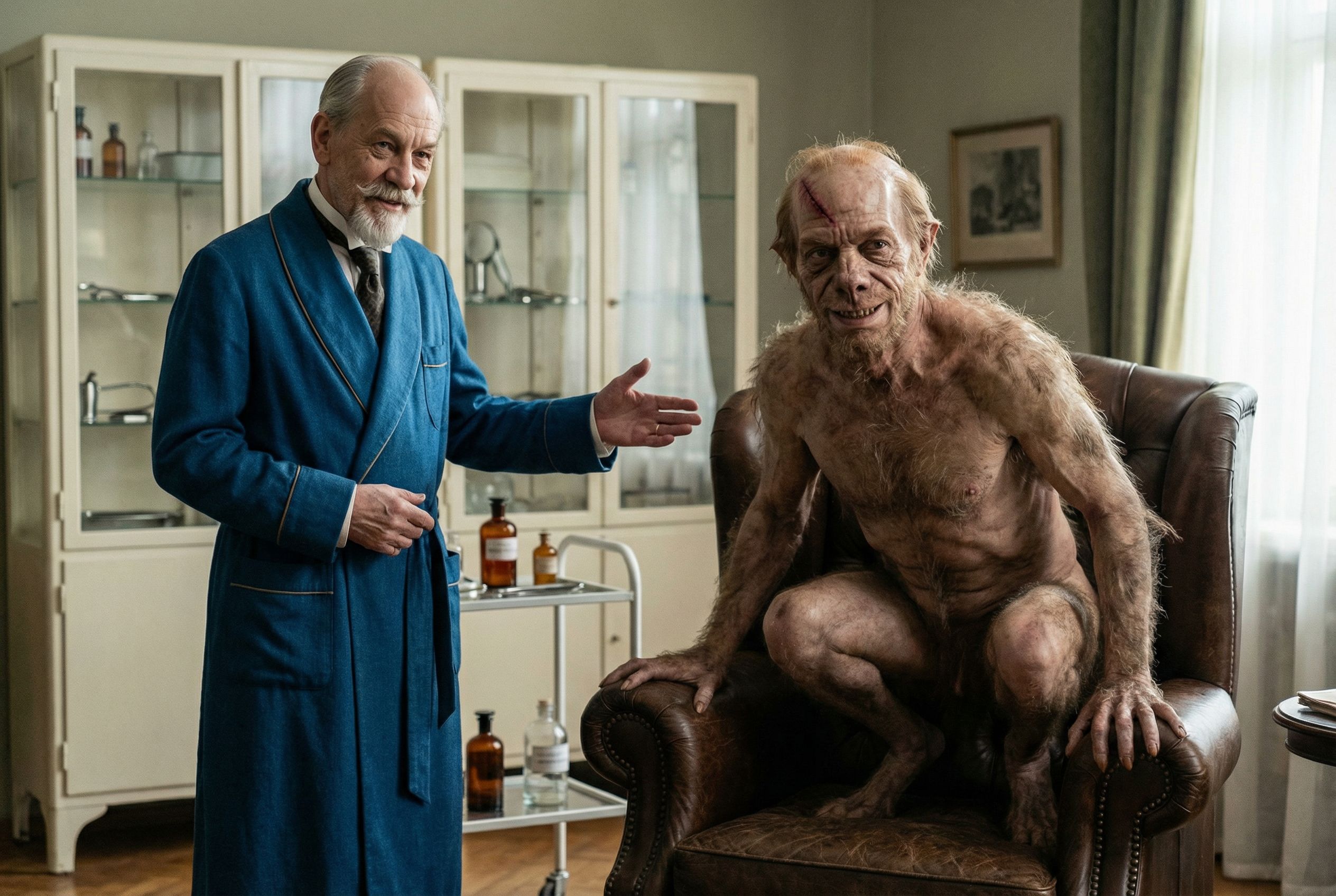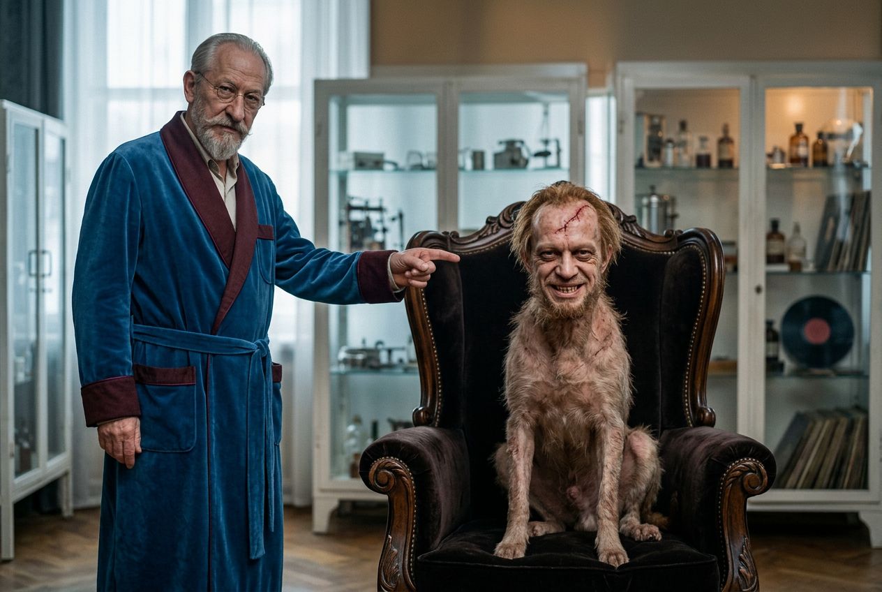 Москва, СССР, 1920-е годы. Просторная, ярко освещённая приёмная богатой профессорской квартиры. В центре композиции, в массивном кресле, на корточках сидит странное существо (CHAR1). Слева от него стоит уверенный в себе хозяин квартиры (CHAR2), жестом руки указывая на сидящего. На заднем плане едва намечены большие застеклённые медицинские шкафы. Главный акцент сделан на композиционном и смысловом контрасте между абсолютным спокойствием стоящего профессора и шокирующим видом существа, сидящего на корточках в кресле. Пространство не перегружено деталями, всё внимание сфокусировано на двух главных фигурах.