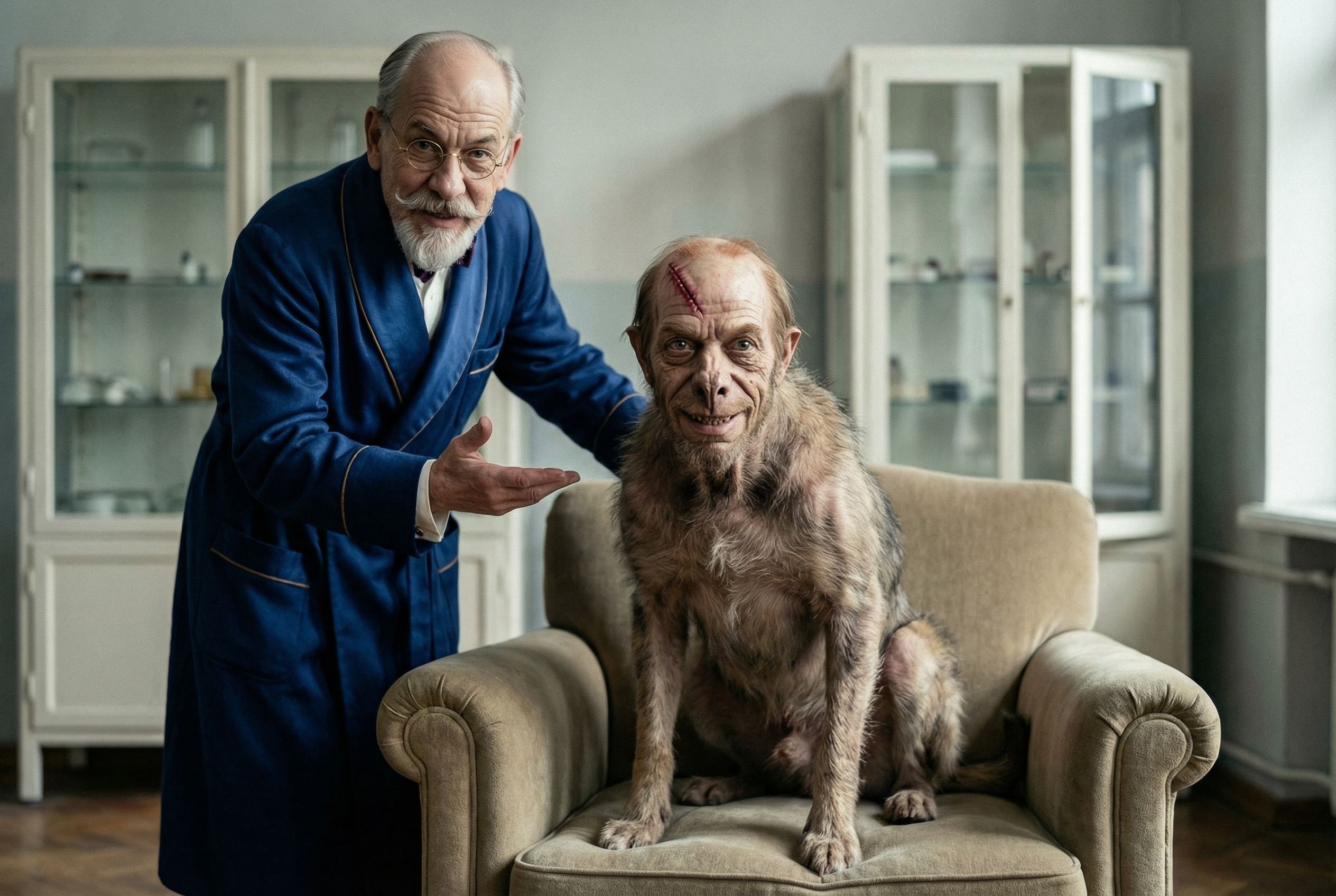 Существо кошмарного вида в стадии стремительного обратного превращения из человека в собаку. По размеру оно чуть больше крупной дворняги и заметно меньше взрослого человека. Фигура компактная, приземистая, с пластикой где-то между псом и крупной обезьяной. Пёс, который сидит на корточках в кресле и странно улыбается. Местами он совершенно лысый, местами покрыт неровной, клочковатой отрастающей шерстью. На лбу отчётливо виден свежий, багровый хирургический шрам.