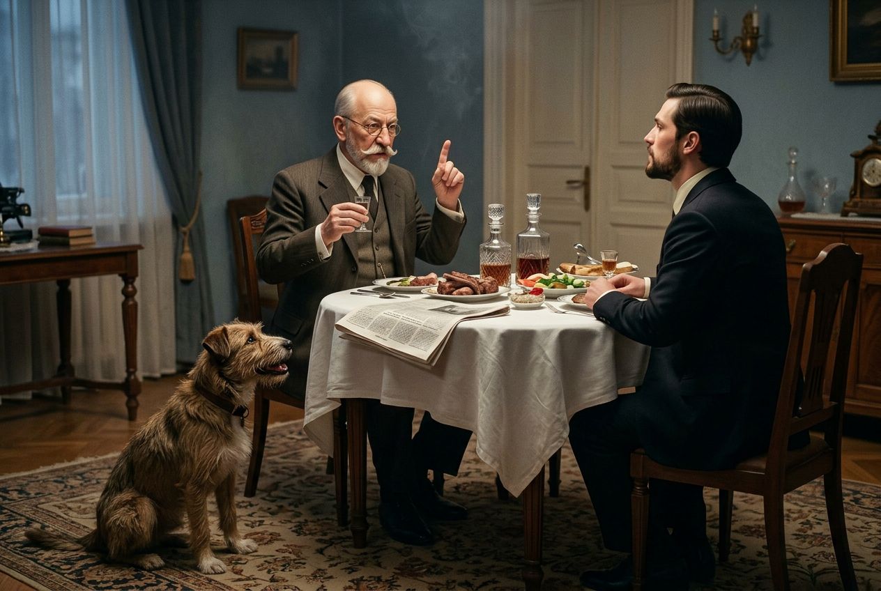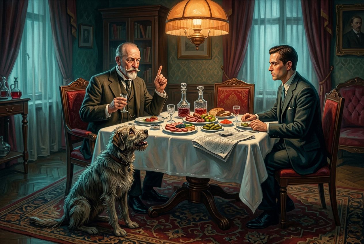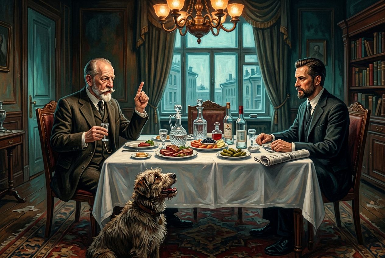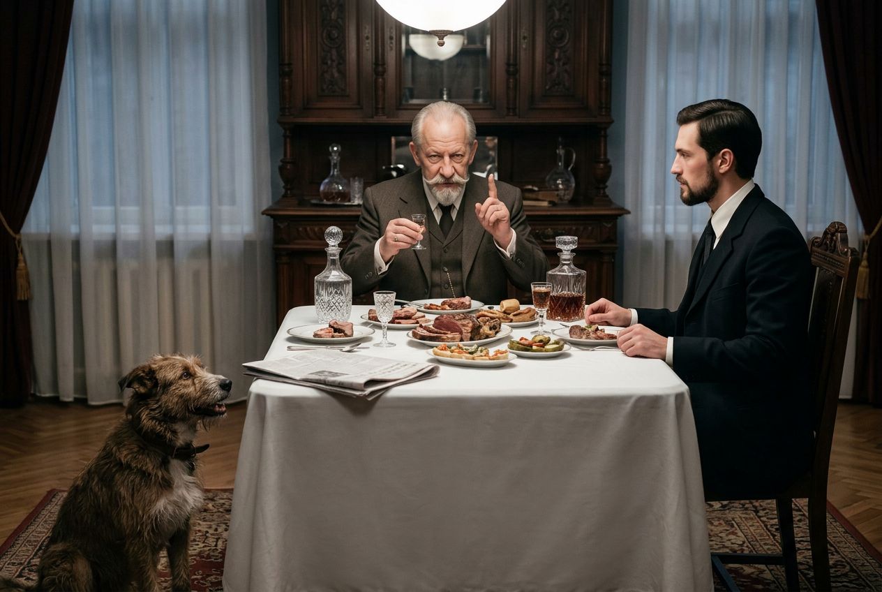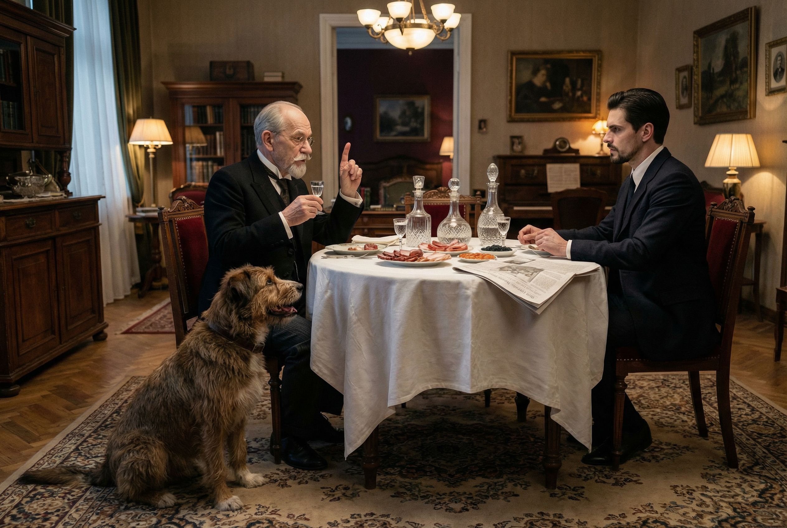 Москва, середина 1920-х годов, богато обставленная столовая в просторной профессорской квартире. За изысканно сервированным столом сидит профессор Преображенский (CHAR1). Он держит в одной руке маленькую рюмку, а указательный палец другой руки назидательно поднял вверх. Напротив него за столом расположился доктор Борменталь (CHAR2). На столе лежат белоснежная скатерть, хрустальные графины, тарелки с закусками и небрежно отодвинутая в сторону свернутая газета. У ног профессора на ковре сидит пес Шарик (CHAR3), который завороженно, с приоткрытой пастью, смотрит на блюда с мясом. Композиция строится вокруг ярко освещенного обеденного стола, передавая атмосферу сытого домашнего уюта и контраст между уверенными в себе людьми и ожидающим угощения уличным животным.