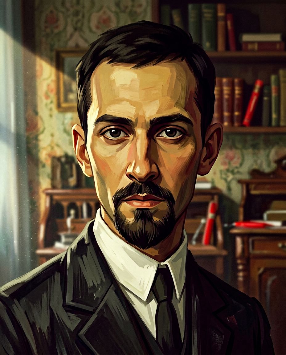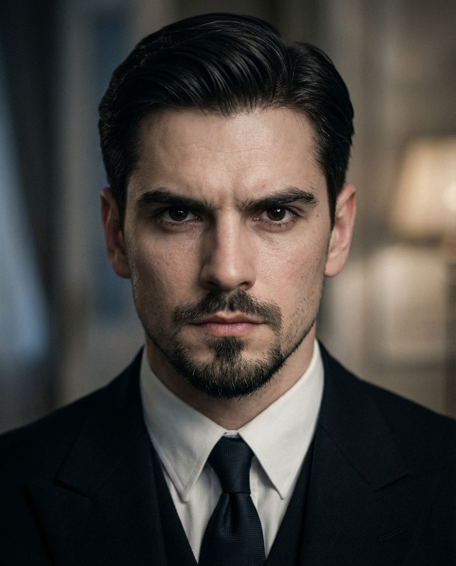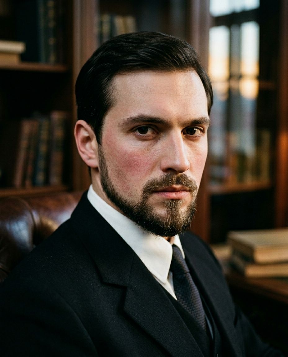 Молодой мужчина около 25–30 лет, центральноевропейского или ашкеназского фенотипа, типичный представитель московской медицинской интеллигенции. Лицо поразительно красивое, благородное, с правильными чертами. Тёмные, аккуратно зачёсанные волосы. На подбородке ухоженная короткая острая клиновидная бородка. Глаза тёмные, выразительные; взгляд пронзительный, сфокусированный, очень решительный, жёсткий и волевой, таящий в себе скрытую угрозу при внешней невозмутимости. Кожа светлая, здорового оттенка, с лёгким морозным румянцем на щеках. Телосложение крупное, атлетичное: в кадре хорошо видны широкие массивные плечи и прямая гордая осанка. Одет в строгий, дорогой, идеально сидящий чёрный костюм по моде 1920-х годов, безупречную белую рубашку с жёстким воротничком и тёмный галстук. Образ сочетает в себе лоск блестящего молодого врача, интеллигентную вежливость и скрытую физическую силу.