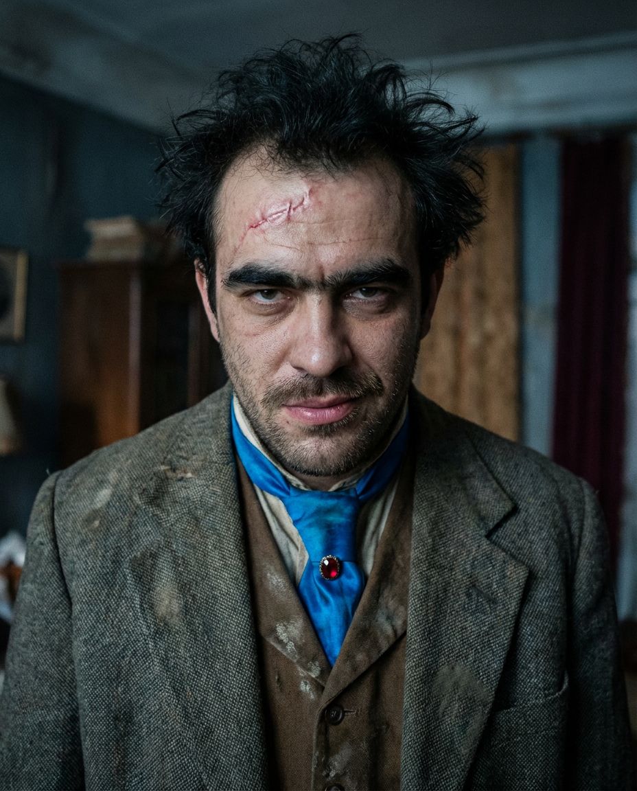 Мужчина около 25-30 лет, восточноевропейского фенотипа с грубыми, маргинальными чертами лица. Голова маленького размера, сутулые плечи, втянутая шея. Выдающаяся особенность — экстремально низкий лоб, поперёк которого чётко виден свежий хирургический шрам. Густые чёрные брови топорщатся кисточками, и почти сразу над ними начинается линия роста волос. Волосы чёрные, очень жёсткие, растут неопрятными клоками и торчат в разные стороны, напоминая щётку. Лицо несимпатичное, щёки и подбородок покрыты неопрятным пухом и щетиной, под носом — жидкие усишки. Взгляд тяжёлый, исподлобья, с выражением наглости, подозрительности и тупой агрессии. Губы слегка оттопырены, рот искривлён в язвительной, самоуверенной усмешке. Одет кричаще безвкусно и неряшливо: помятый, грязноватый пиджак с чужого плеча, на шее повязан нелепый галстук ядовито-небесного (ярко-голубого) цвета, заколотый фальшивой рубиновой булавкой. Весь облик передаёт агрессивное невежество и проглядывающие сквозь человеческую оболочку собачьи повадки.