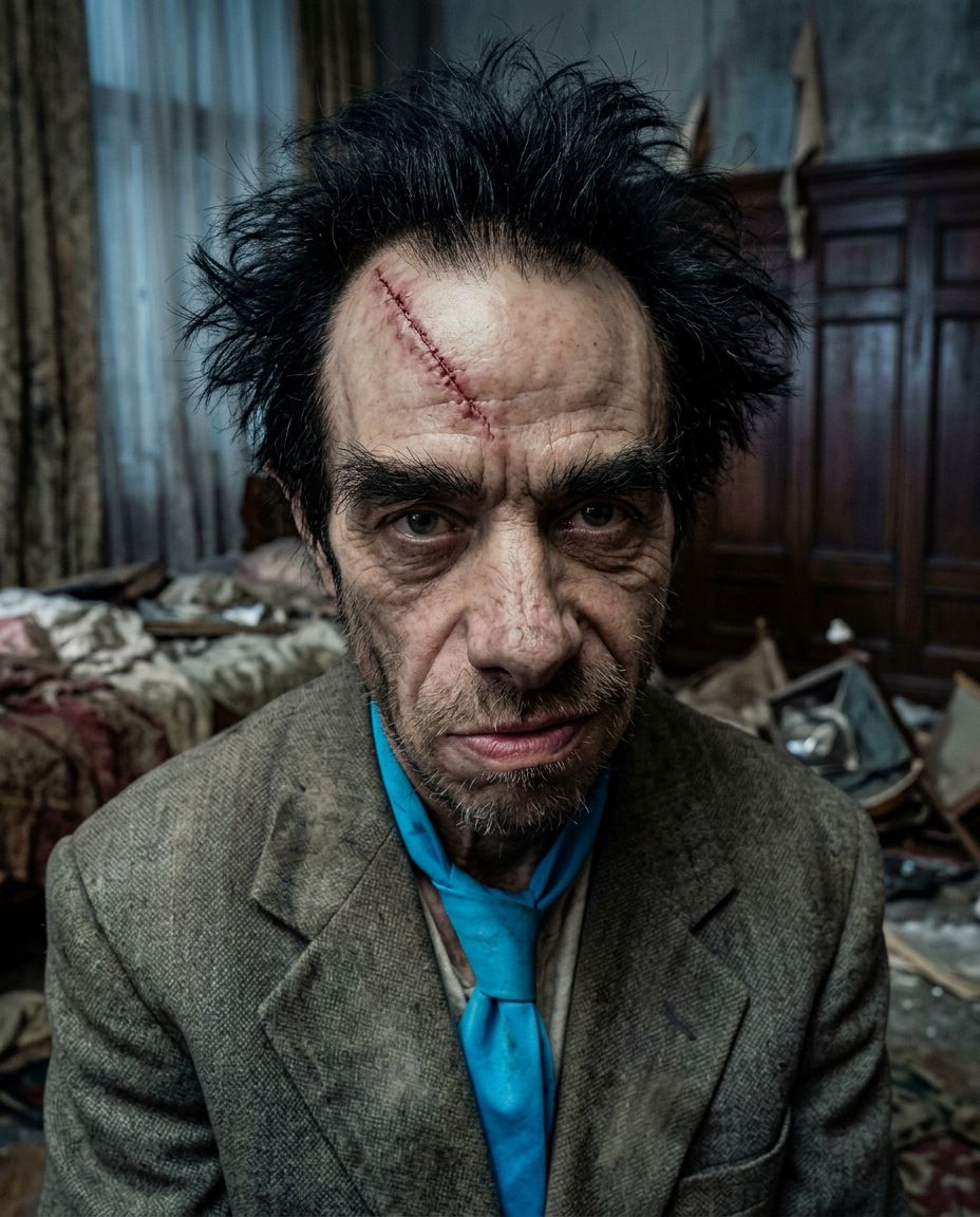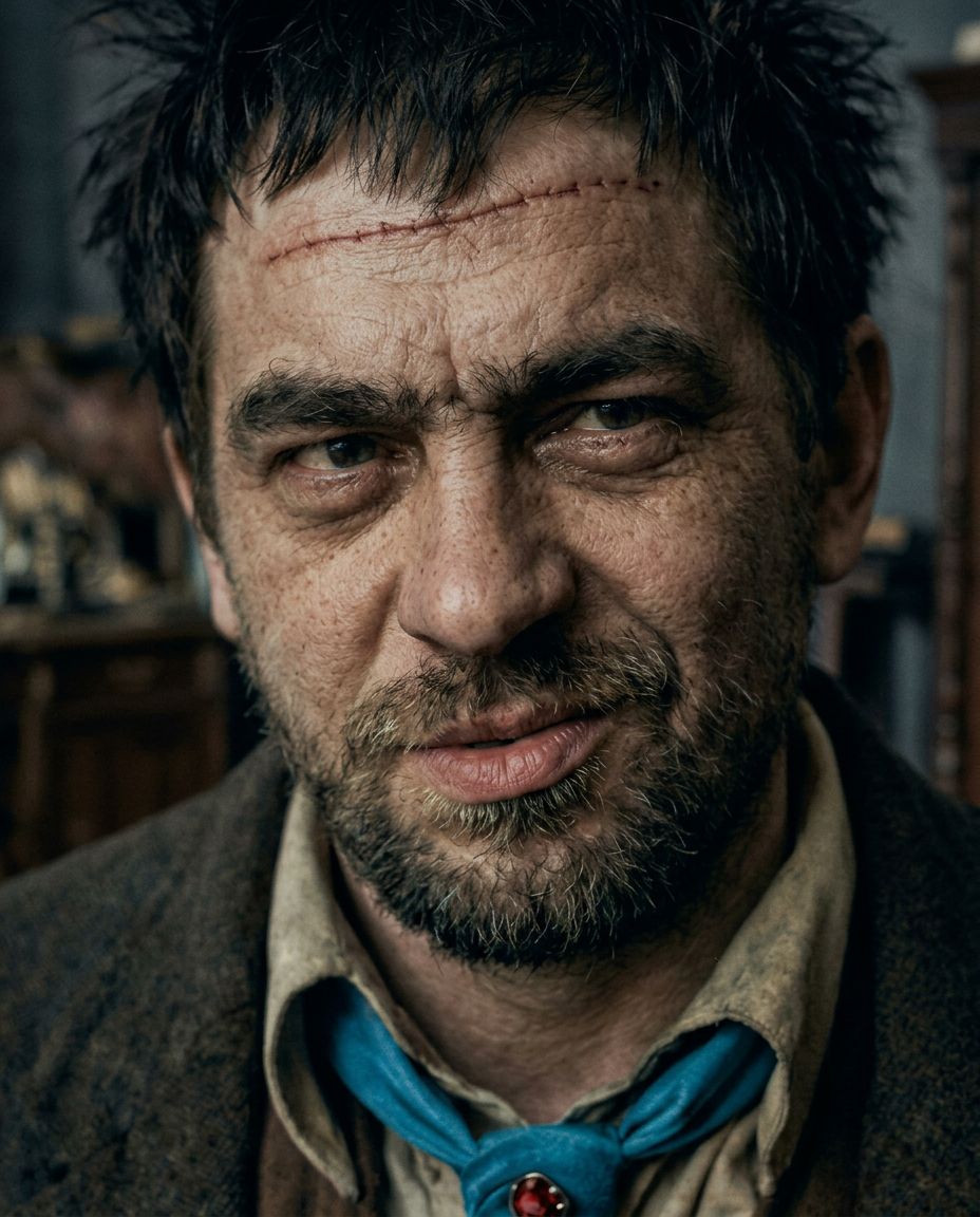 Кинематографичный фотореализм с сатирическим гротеском. Реалистичные лица, ткани и интерьеры без живописной стилизации, но с лёгкой характерной гиперболой мимики и типажей. Палитра приглушённая: табачные, оливковые, кремовые и холодно-синие тона с едкими бордово-красными акцентами. Мягкая плёночная фактура, раннесоветский абсурд, чёрная комедия и социальная насмешка.